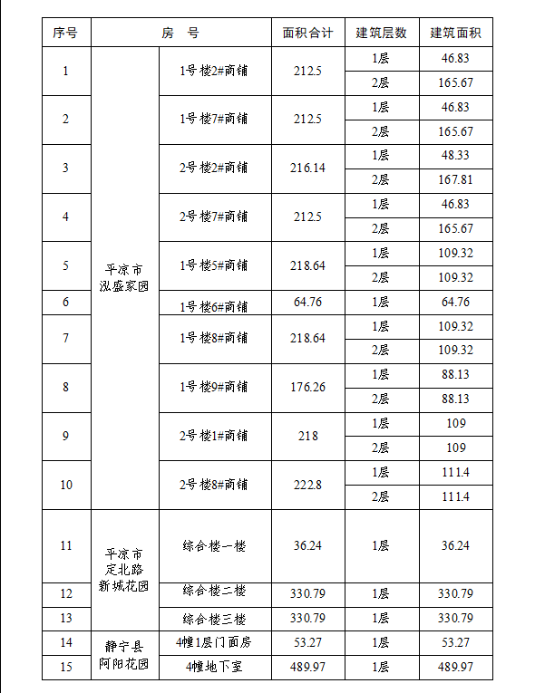 2020-12-15平?jīng)鲢垂I(yè)投資發(fā)展有限責(zé)任公司現(xiàn)有位于平?jīng)鍪嗅轻紖^(qū)十里鋪泓盛家園的商鋪、崆峒區(qū)定北路綜合樓及靜寧縣阿陽花園地下室,現(xiàn)對外公開出租。具體情況公告如下∶一、出租房屋基本情況二、房屋出租期限及租金∶按上述房屋基本情況,房屋出租期限及租金面議。三、租賃合同